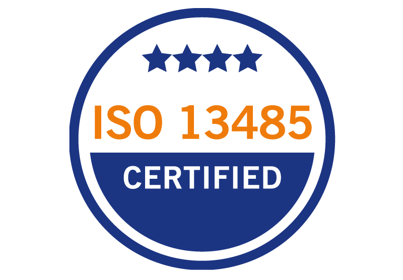 The compliance with ISO 13485 is achieved through certification by an approved certification body and independent internal audits.